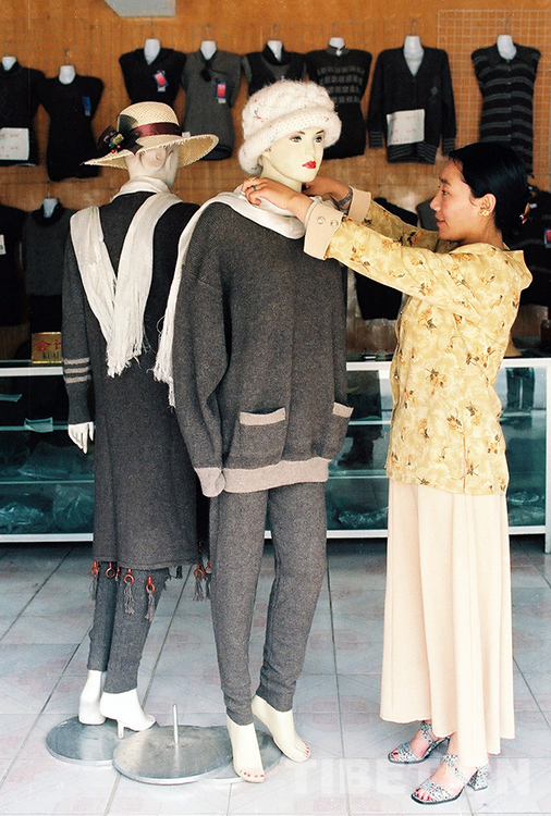 這是那曲地區(qū)(現(xiàn)那曲市)班戈縣絨毛分梳廠拉薩門市部經(jīng)理阿吉姆正在整理所經(jīng)銷的牦牛絨衫。由于牦牛絨衫相對于羊絨衫價格低、質(zhì)量好,在拉薩市場很受人們歡迎(唐召明1997年攝)