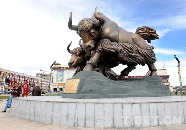 這是藏北首府那曲鎮(zhèn)街頭的“藏北勁牛”牦牛雕塑(唐召明2012年8月5日攝)