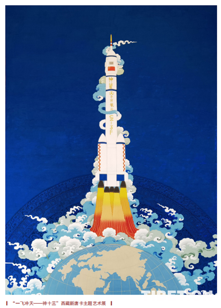 唐卡藝術(shù)家邊巴的新唐卡作品《一飛沖天》,以神舟十三號為主題,描繪了飛船沖出地球奔向星辰大海的瞬間。飛船、地球、祥云的后面,有一個融入背景的曼荼羅圖案,象征著西藏傳統(tǒng)的宇宙觀。傳統(tǒng)地道的勉唐派唐卡繪畫語言,采自天然礦物富有環(huán)保特征的厚實顏色,漢藏融合的審美品位,立足中國放眼世界的人類命運共同體胸懷,正是新時代新唐卡新融合的藝術(shù)表達。
