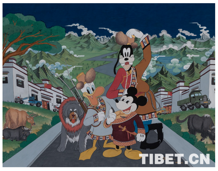 唐卡藝術(shù)家邊巴的新唐卡《逛新城》,同樣的青山綠水,同樣的社會主義新農(nóng)村,不同的是,他讓米老鼠和唐老鴨穿上藏裝來做客了。隨著拉薩近年來的城市巨變,知名企業(yè)、品牌進駐城市,也以獨特的風格資源和自身亮點成為旅游勝地,一個嶄新而充滿活力的現(xiàn)代化拉薩正在崛起。作品在傳統(tǒng)與現(xiàn)代之間所傳遞的沖撞與融合,展現(xiàn)的自信與從容,正是中華文化的主流價值所在。