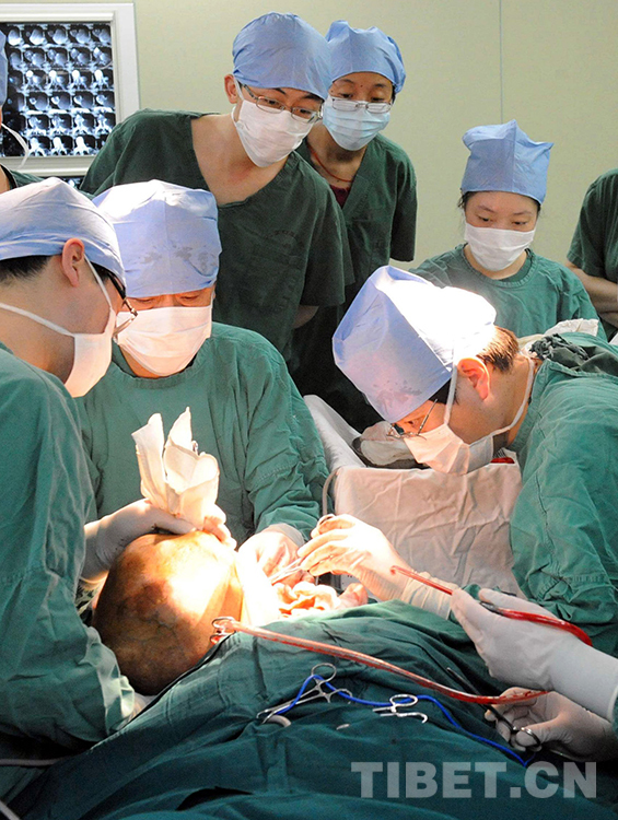 這是北京口腔醫(yī)院口腔頜面外科醫(yī)生在為牧女斯求卓瑪實施手術(shù),將其脖子上一個重達(dá)5公斤的巨大腫瘤成功切除(唐召明2010年4月21日攝)