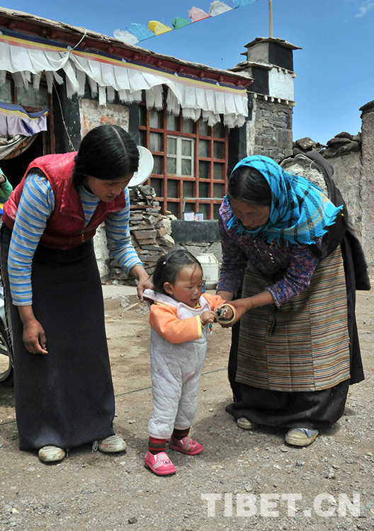 這是斯求卓瑪(右)與女兒嘎瑪旺姆一起,幫助外孫女學(xué)走路(唐召明2015年7月15日攝)