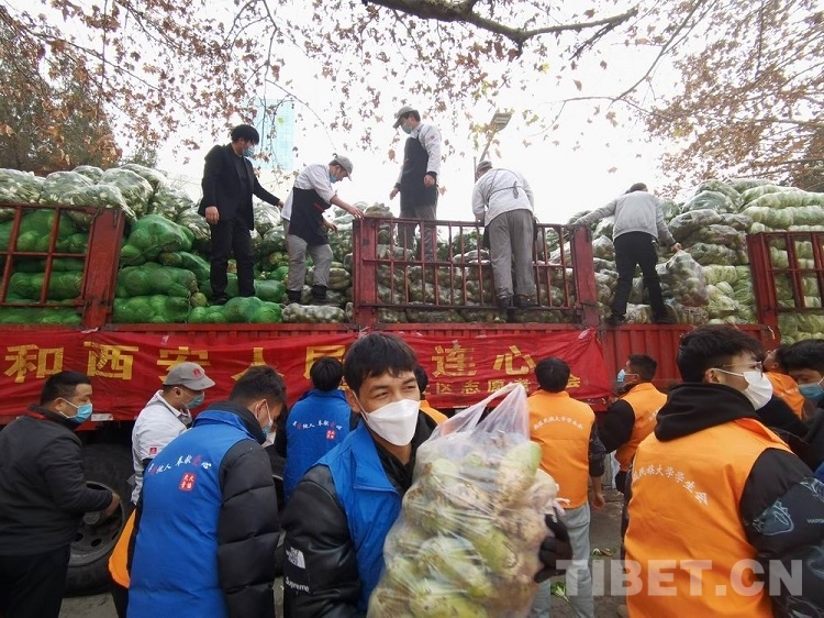 圖為西藏民族大學(xué)志愿者搬運(yùn)受贈(zèng)蔬菜