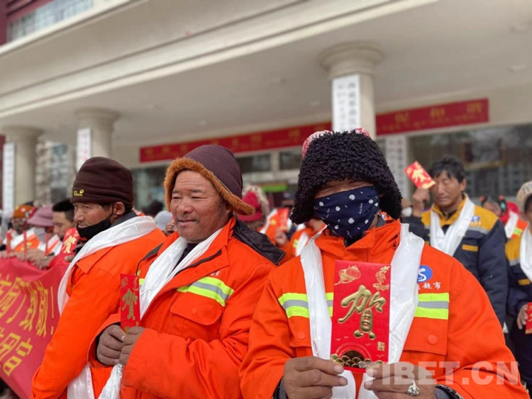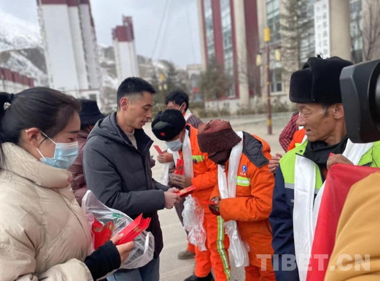 中國(guó)西藏網(wǎng)訊 2月28日,在藏歷新年到來(lái)之際,西藏自治區(qū)那曲市比如縣政府大樓前正在開(kāi)展一場(chǎng)溫暖人心的慰問(wèn)活動(dòng)?!靶履旰茫o大家拜年了,衷心祝愿大家在新的一年里身體健康、工作順利?!?慰問(wèn)現(xiàn)場(chǎng),川英集團(tuán)負(fù)責(zé)人向每位環(huán)衛(wèi)工人和城管協(xié)管員獻(xiàn)上潔白的哈達(dá)致以新年的美好祝福,感謝他們?yōu)楸热绛h(huán)衛(wèi)事業(yè)作出的貢獻(xiàn),并送上1000元慰問(wèn)金。(中國(guó)西藏網(wǎng) 記者/賈華加 比如縣宣傳部供圖)