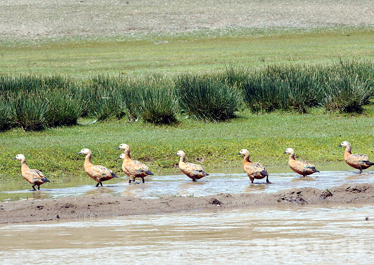 這是在藏北申扎縣境內(nèi)排隊行走的赤麻鴨(唐召明2009年攝)