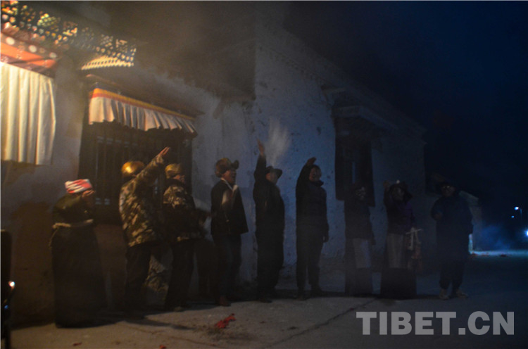 酒足飯飽后,“驅(qū)鬼”儀式開(kāi)始。家人們一起各自用糌粑從頭到腳觸碰一遍、捏下手印后,與故意吃剩的一點(diǎn)古突扔進(jìn)驅(qū)鬼盤,寓意將身心中的病痛與不詳全部拋掉。隨后查斯點(diǎn)燃火把,一邊喊著“所有妖魔都出去”,一邊手持火把跑往所有屋子各掃幾下,拿著火把和驅(qū)鬼盤到交叉路口焚燒掉。一路狂奔,且不能回頭。
