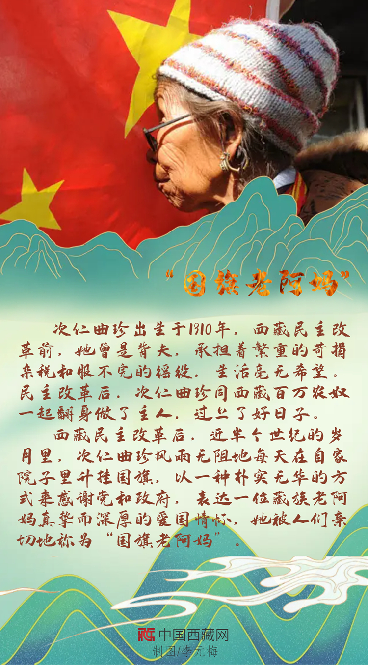 西藏民主改革后,次仁曲珍在自家院子里升起國旗,這一升就是近半個世紀,一天不落,風雨無阻。只有經(jīng)歷過舊西藏的人才知道新西藏的可貴,翻身成為國家主人的“國旗老阿媽”,以上萬天堅持不渝的行動表達著自己樸素的愛國情懷。