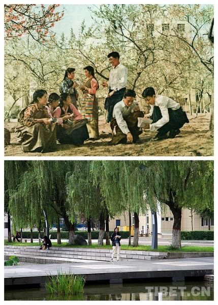 上圖為西藏民族大學建校初期(時稱西藏公學),學生在校園里學習,圖片由西藏民族大學提供;下圖為2019年10月,學生在校園里學習 攝影:王媛媛