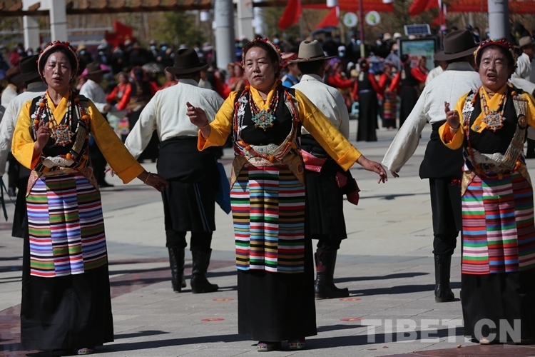 文藝演出結(jié)束后,現(xiàn)場(chǎng)響起歡快的鍋莊舞曲,400余名日喀則各族群眾跳起鍋莊,以這種大聯(lián)歡的形式,共同慶祝63年前擺脫苦難、重獲新生,以及今天的幸福生活。