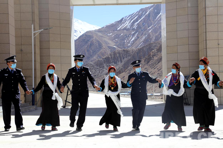 活動中,邊民群眾與移民警察在國門下興高采烈地跳起了藏族傳統(tǒng)鍋莊舞,用歌聲和舞蹈表達他們的喜悅心情,以自己的方式慶祝這一不凡的日子。