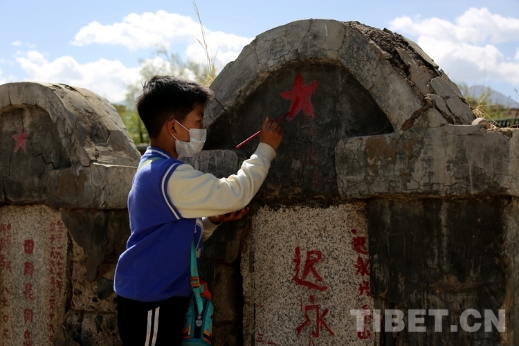 圖為榮灝達(dá)瓦為革命烈士墓碑上的紅星增添顏色 攝影:王佳豪