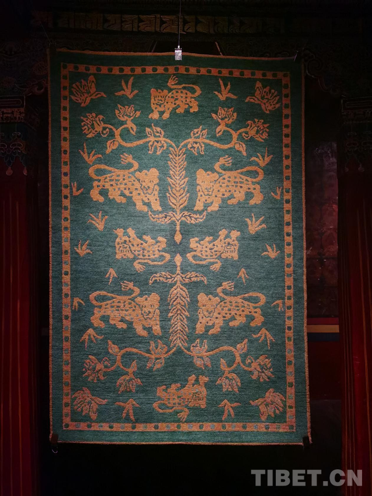生活在不同地區(qū)的中華民族先民們都不約而同地有著對虎的崇拜和描繪。據(jù)了解,“云從龍,風從虎”在中國古代先秦時期,虎一度與龍并列而成為權(quán)力和力量的象征。根據(jù)相關(guān)文獻記載,早在5000年前,西藏阿里地區(qū)的居住者就將虎皮紋飾等符號刻在巖石上;公元7世紀前后,松贊干布曾頒布《三十六制》,提到“虎皮褂、虎皮裙、虎皮袍”等成為“六勇飾”,只有獲得地位和相當成就的人才能佩戴,虎的圖案也自此融入地毯等西藏織物中。