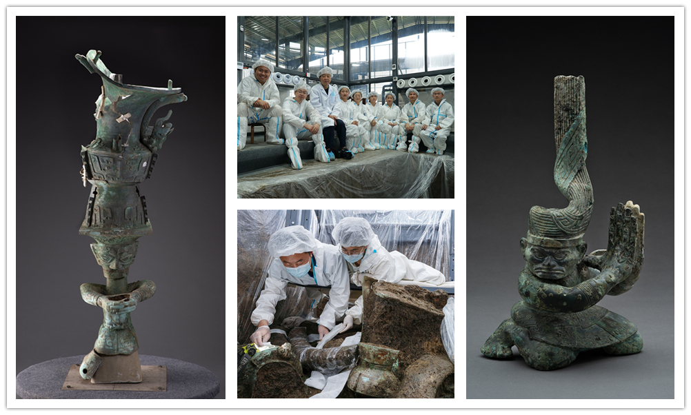 圖左為三星堆遺址三號坑出土銅頂尊跪坐人像;圖中上為部分發(fā)掘人員合影;圖中下為象牙保護與提?。粓D右為三星堆遺址四號坑出土扭頭跪坐銅人像 圖片來源:國家文物局