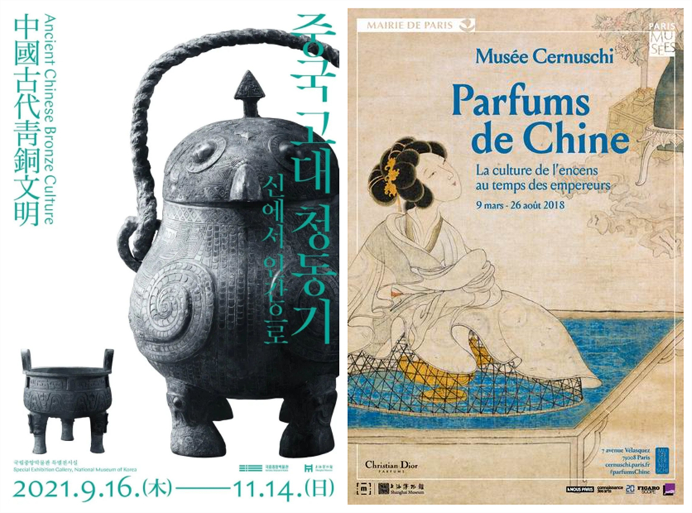圖左為2021年9月,上海博物館在韓國國立中央博物館舉辦“中國古代青銅文明”特展海報;圖右為2018年上海博物館在法國巴黎舉辦的“中國芳香:古代中國的香文化”展覽海報 圖片來源:上海博物館