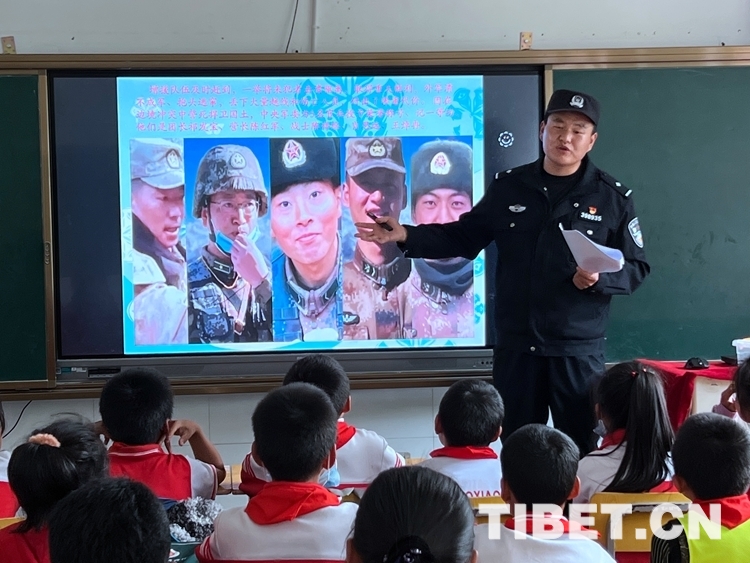 中國西藏網(wǎng)訊 “同學(xué)們,大家知道照片上這位英雄是誰嗎?”伴隨著民警周升展的提問聲,孩子們紛紛舉起手回答出了這位英雄——祁團(tuán)長?!澳銈冋媛斆鳎裉焓迨褰o大家講一講新時(shí)代衛(wèi)國戍邊英雄祁發(fā)寶團(tuán)長的故事……”