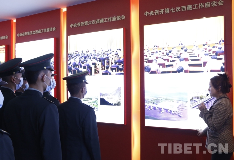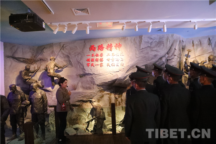 “1959年3月28日,中央政府宣布解散西藏地方政府,徹底砸碎了桎梏西藏上千年的封建農奴制,西藏翻開了新的歷史篇章?!痹谥v解員的引導下,該團80名青年官兵走進西藏百萬農奴解放紀念館,沿著革命先輩的足跡,聆聽著崢嶸歲月里一段段感人至深的紅色故事,2700平方米的展廳中陳列了800多件歷史文獻檔案資糧、文物實物、圖片和展陳藝術作品,詳細介紹了中國共產黨帶領西藏各族人民進行偉大的民主改革,使百萬農奴翻身得解放的廢奴歷史。