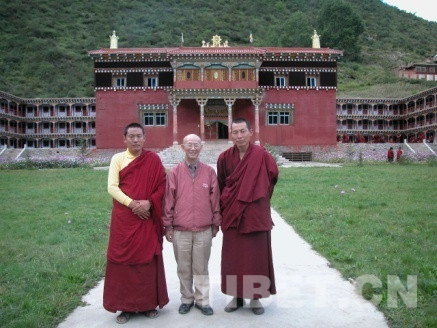 2004年9月3日,陳慶英先生在西藏自治區(qū)昌都市江達(dá)縣瓦拉寺調(diào)研,拍攝下大經(jīng)堂外廊21幅《格薩爾》壁畫。其后將他在寺內(nèi)外所拍全部珍貴照片贈(zèng)送作者,希望作者好好研究。圖為陳老師與瓦拉寺僧人合影。