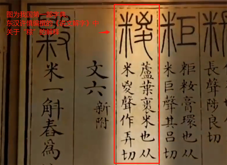 關(guān)于粽子,比較早的文字記載,在距今近2000年前,由東漢學(xué)者許慎編纂的我國第一部真正意義上的字典《說文解字》中可以找到——“糉,蘆葉裹米也”。這個記載言簡意賅地說明了制作粽子的原料和方法?!凹F”字就是我們現(xiàn)在使用的“粽”字。