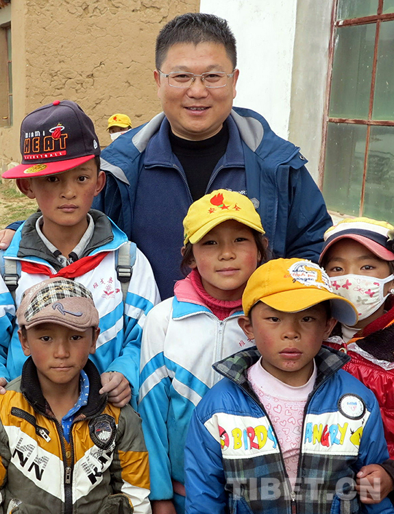 這是中國石化援藏干部王鵬雁與班戈縣小學的學生們合影留念(扎西2013年8月29日攝)