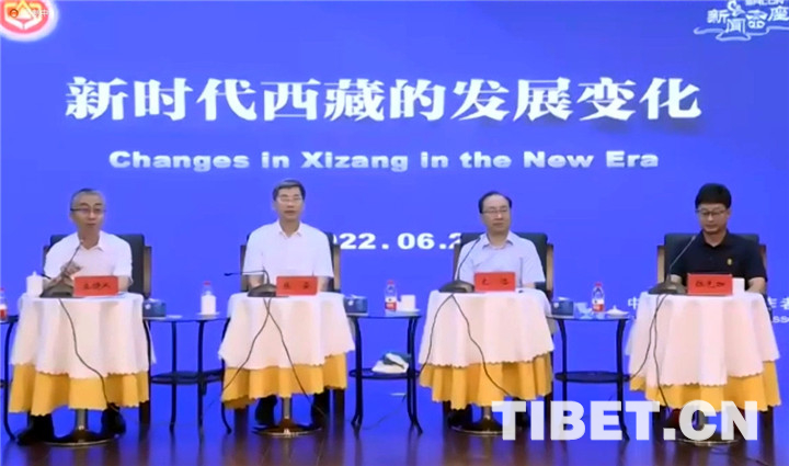 圖為6月22日,中國藏學(xué)研究中心二級(jí)研究員、學(xué)術(shù)委員會(huì)委員張?jiān)疲ㄗ蠖?,社?huì)經(jīng)濟(jì)研究所所長、研究員扎洛(左三),宗教研究所副所長、副研究員拉先加(右一)參加中國記協(xié)舉辦的“新時(shí)代西藏的發(fā)展變化”新聞茶座 截圖:劉莉
