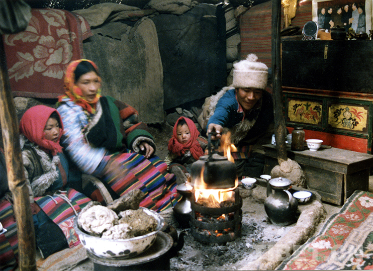 這是文部辦事處(現(xiàn)尼瑪縣)一戶牧民人家在帳篷里用牛糞取暖燒茶(唐召明1989年12月攝)
