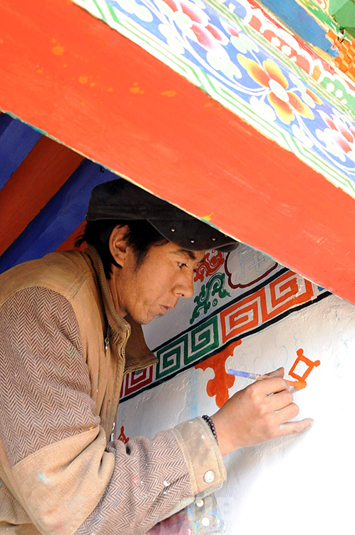 這是尼瑪縣文部鄉(xiāng)南村一戶人家請來畫師為自家安居新房進行室內(nèi)彩繪(唐召明2009年攝)