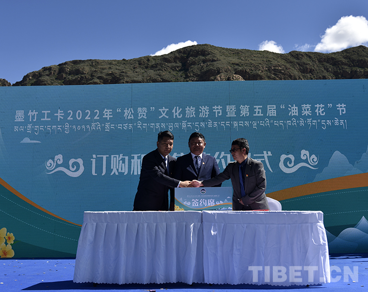 在油菜花田中舉辦的開幕式上,墨竹工卡縣農(nóng)牧業(yè)凈土產(chǎn)業(yè)發(fā)展有限公司代表與唐加鄉(xiāng)、扎西崗鄉(xiāng)分別簽訂認購、預售合同。在豐收時節(jié),該公司將以高出市場的價格訂單式收購當?shù)剞r(nóng)戶種植的油菜,預計收購4000噸油菜籽。