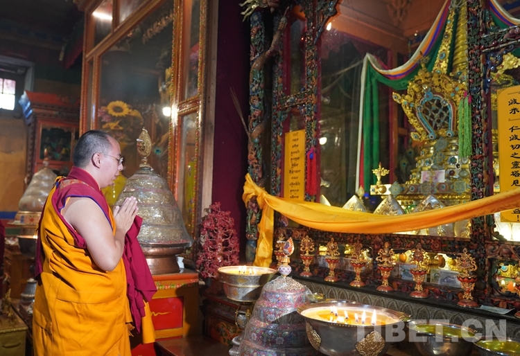 圖為班禪在羊堅多康殿波米仁波切靈塔前誦經祈禱 攝影:王淑
