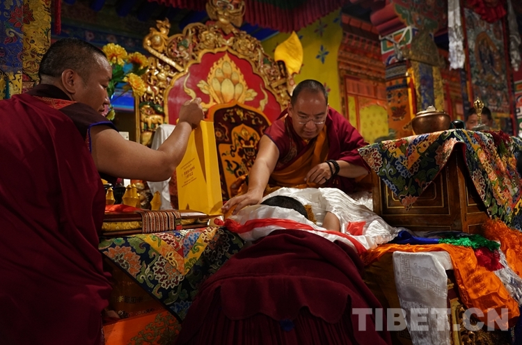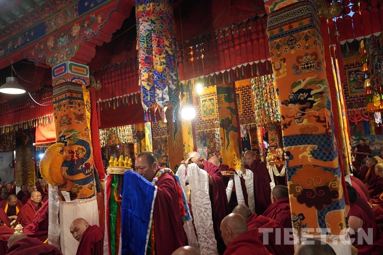 法號齊鳴、法鑼合奏,眾僧以隆重的宗教儀軌迎接班禪。班禪抵達藏傳佛教格魯派祖寺甘丹寺后在僧眾的簇擁下,先后步入羊堅多康殿、宗喀巴大師靈塔殿、十八羅漢殿朝拜、誦經、敬獻哈達。