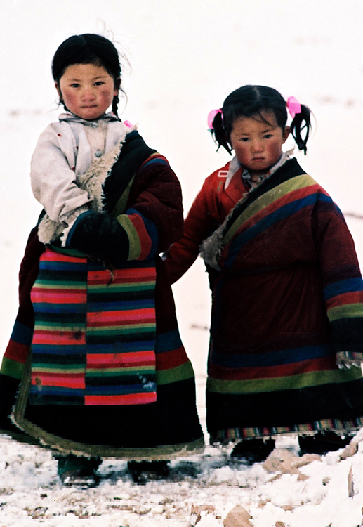 那是1989年歲末最后幾天,我隨藏北那曲地區(qū)(現(xiàn)那曲市)基層政權(quán)建設(shè)工作現(xiàn)場會“訪問團(tuán)”來到文部辦事處(現(xiàn)尼瑪縣)參觀。來到卓瓦鄉(xiāng)時,我眼前突然一亮:在雪地上玩耍的草原小姐妹,三五歲的樣子,身著五彩羔皮藏袍,扎著羊角小辮,臉頰上印刻著深紫色“高原紅”。那是草原上一道最美麗的風(fēng)景線,我不由得按動手中相機(jī)快門……