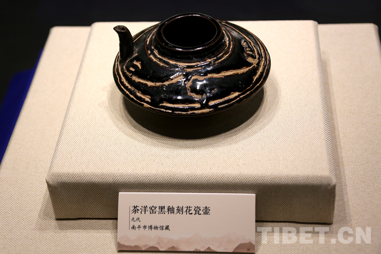 圖為“閩瓷雙璧·交相輝映——福建黑、白瓷器展”展出的茶洋窯黑釉刻花瓷壺 攝影:王佳豪