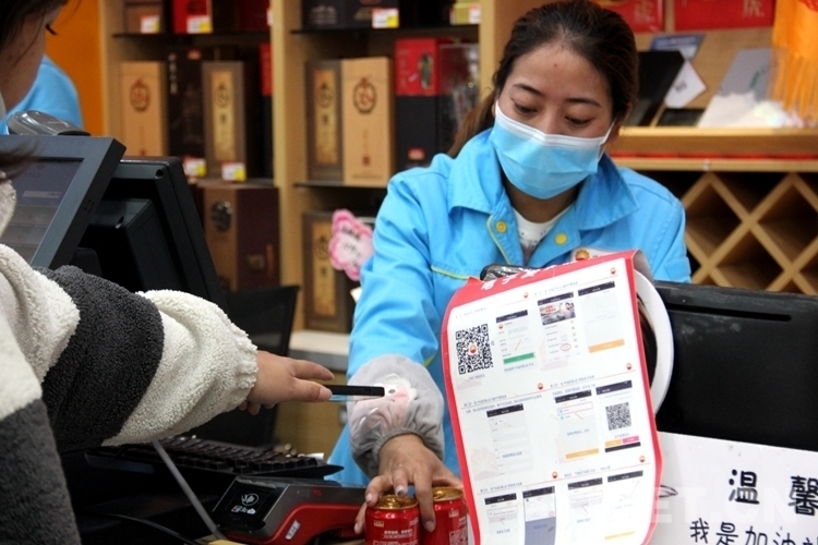 圖為魯朗加油站工作人員在便利店內(nèi)收費(fèi) 攝影:德吉卓嘎