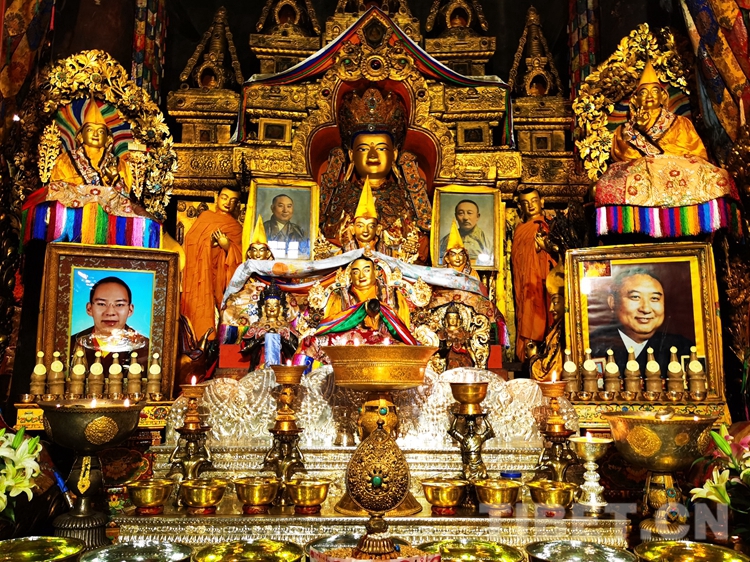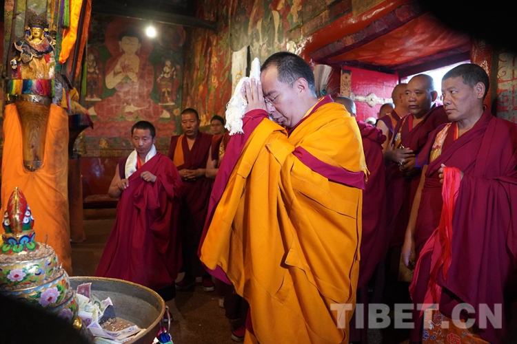 在措欽大殿,班禪虔誠叩拜供奉于此的佛祖釋迦牟尼佛像和藏傳佛教格魯派始祖宗喀巴塑像,與眾僧共同念誦經(jīng)文后,回到寢宮拉讓殿。下午,班禪登上拉讓日光殿寶座,接受扎什倫布寺管委會(huì)僧人成員、高僧朝拜,并為他們摸頂賜福,帶領(lǐng)高僧誦經(jīng)祈福。