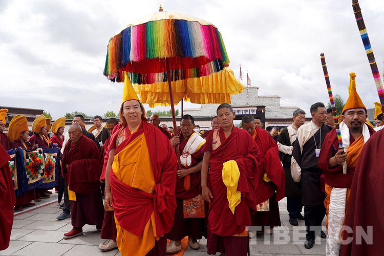 圖為班禪在手持黃傘、香爐的高僧引領(lǐng)下緩緩步行入寺 攝影:王淑