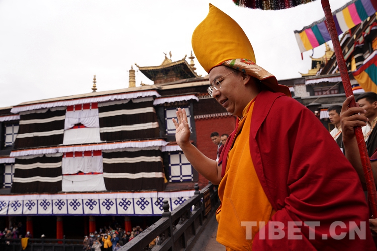 班禪抵達(dá),現(xiàn)場桑煙繚繞,法號(hào)聲悠長,扎什倫布寺僧眾以藏傳佛教最高禮儀迎接班禪?,F(xiàn)場等候班禪的信教群眾紛紛摘帽行禮或雙手合十,向班禪的到來表示熱烈歡迎,班禪見狀揮手致意、送上祝福。隨后,班禪在手持黃傘、香爐的高僧引領(lǐng)下緩緩步行至措欽大殿。