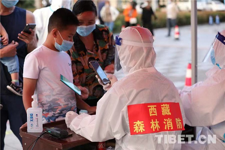 圖為西藏自治區(qū)林芝市森林消防支隊(duì)消防員在核酸采集點(diǎn)查看群眾健康碼