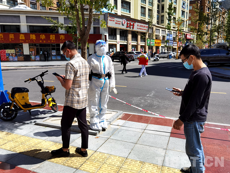 林芝邊境管理支隊機關民警曹婷正在核酸檢測點維護現(xiàn)場秩序 攝影:張航