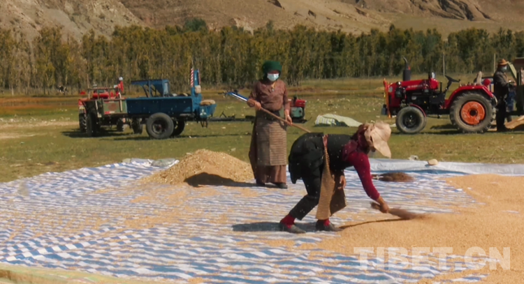 在達(dá)孜區(qū)雪鄉(xiāng)扎西崗村,隨著機(jī)器轟鳴,一顆顆金色飽滿的青稞粒構(gòu)成一扇彩虹門,有人在曬青稞、有人在裝袋、有人在搬運(yùn),一幅和諧的秋收?qǐng)D展現(xiàn)在眼前。