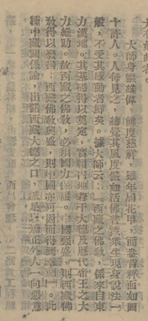 次年,應(yīng)重慶漢藏教理院和成都佛學(xué)社的邀請,東本格西決定前往當(dāng)?shù)刂v法。期間,日本空襲不斷,拉薩官民與弟子因憂慮東本格西安危,力勸其勿前往。但是,東本格西從佛教利益世間的角度出發(fā),認(rèn)為在當(dāng)?shù)孛癖娍嚯y之際,作為僧人更應(yīng)不懼危險(xiǎn),前往當(dāng)?shù)匚拷迕癖姡约偨鈶?zhàn)爭造成的創(chuàng)傷與苦痛。1943年1月,東本格西從拉薩啟程前往理化(今理塘),參加九世班禪靈童尋訪測驗(yàn)事宜。4月,經(jīng)由康定抵達(dá)成都,沿途受到各地政府官員與僧俗弟子的歡迎。東本格西應(yīng)中國邊疆問題研究會邀請講演“佛教與邊疆”,蒙藏委員會委員格桑澤仁翻譯。[3]講演內(nèi)容主要分為三部分:首先,詳細(xì)敘述藏傳佛教發(fā)展演變的歷史,提出因于歷代高僧與中央政府的大力維護(hù)與資助,藏傳佛教發(fā)展的基礎(chǔ)才得以奠定;其次,分析邊疆佛教的分布與信仰狀況;最后,分析佛教與邊疆的關(guān)系。[4]他在講到佛教昌盛與國家實(shí)力發(fā)展之間的關(guān)系時(shí),明確提出“西藏之佛教,必須國力保護(hù),中國強(qiáng)盛,則藏傳佛教得以發(fā)揚(yáng),藏傳佛教興盛,則中國亦可因而得到幸福”[5]。東本格西從歷史和現(xiàn)實(shí)角度詮釋西藏作為中華民族共同家園的角色,邊疆不惟具體的地理概念和信仰文化差異的標(biāo)簽,而是中央政府長期支持發(fā)展的歷史凝結(jié),是中華民族共同家園的一分子。