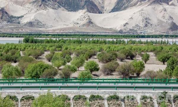 圖為西藏自治區(qū)山南市境內的澤貢高等級公路與遠處的拉林鐵路掩映在綠樹之中。