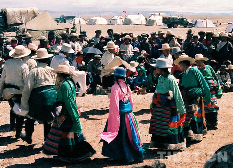 這是在那曲地區(qū)文部辦事處(現(xiàn)那曲市尼瑪縣)所舉行的傳統(tǒng)賽馬會上,牧人們跳起歡快的“鍋莊”舞(唐召明1987年攝)