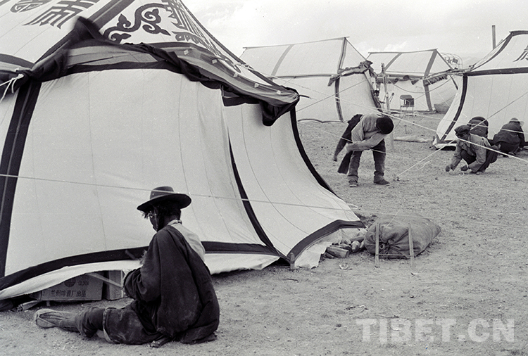 這是那曲地區(qū)文部辦事處(現(xiàn)那曲市尼瑪縣)舉行傳統(tǒng)賽馬會前,人們臨時在搭建各家的白色帆布帳篷(唐召明1987年攝)