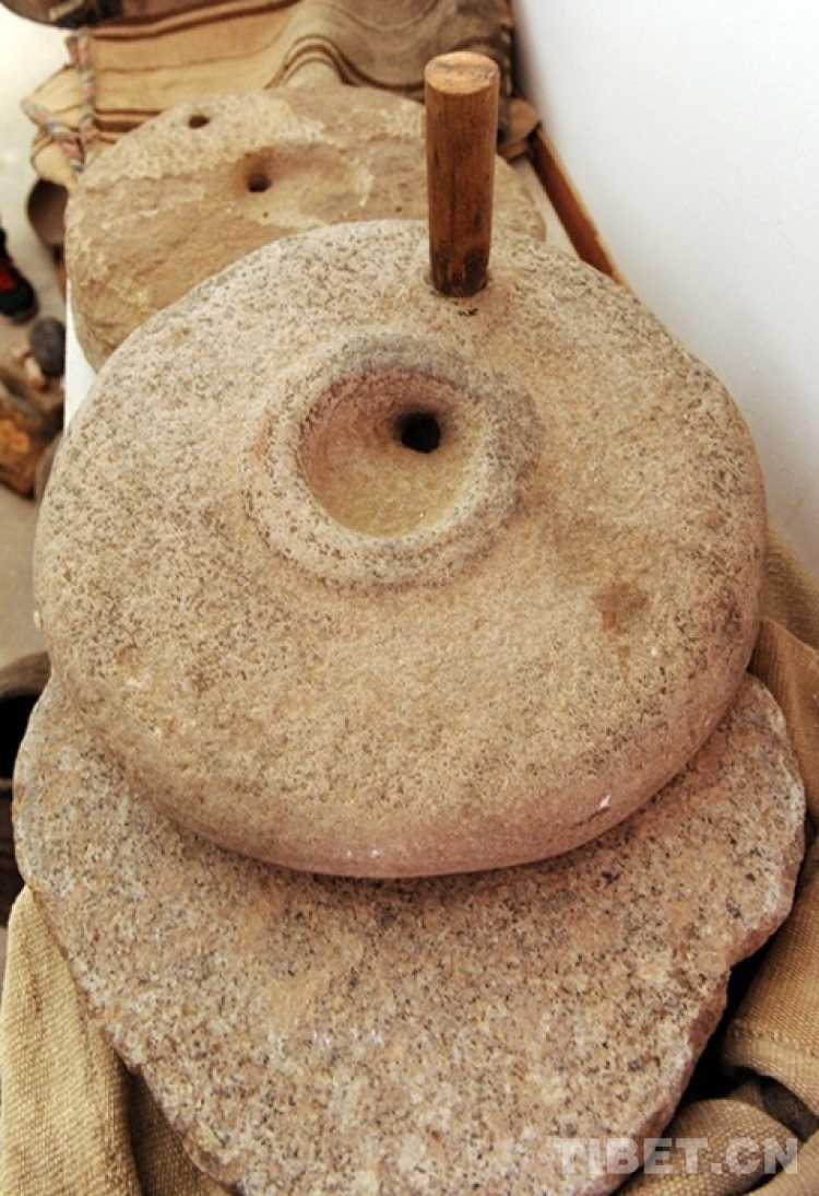 家庭生活用具,有炒青稞的平底鍋,磨糌粑的小石磨,煮“土巴”的盆和鍋。還有圓柱形的酥油筒、酥油茶筒,以及茶壺、木碗、長勺子等。