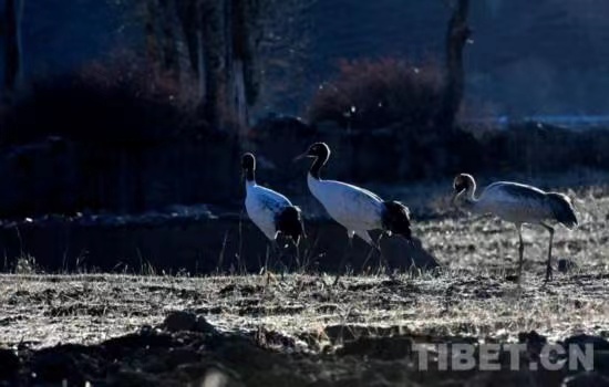 圖為黑頸鶴在西藏自治區(qū)拉薩市林周縣境內(nèi)的田野覓食 攝影:王媛媛