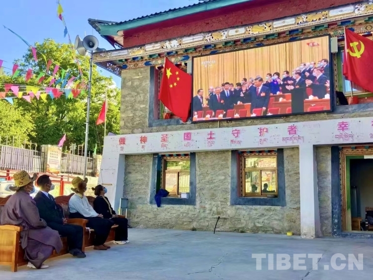 圖為西藏自治區(qū)林芝市朗縣朗鎮(zhèn)托麥村村干部通過電視大屏收聽收看黨的二十大開幕會(huì) 圖片由林芝市委宣傳部提供