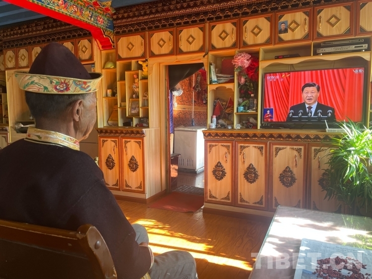 圖為西藏自治區(qū)林芝市巴宜區(qū)布久鄉(xiāng)老黨員在家觀看黨的二十大開幕會(huì) 圖片由林芝市委宣傳部提供