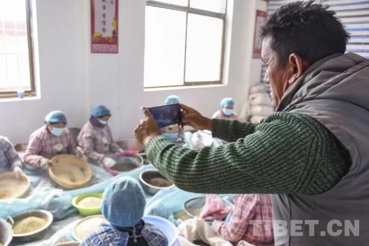 圖為瓊結縣下水村江瑟農(nóng)產(chǎn)品專業(yè)合作社一名農(nóng)牧民群眾正在蕎麥加工車間錄制小視頻上傳至“文化銀行”兌換積分