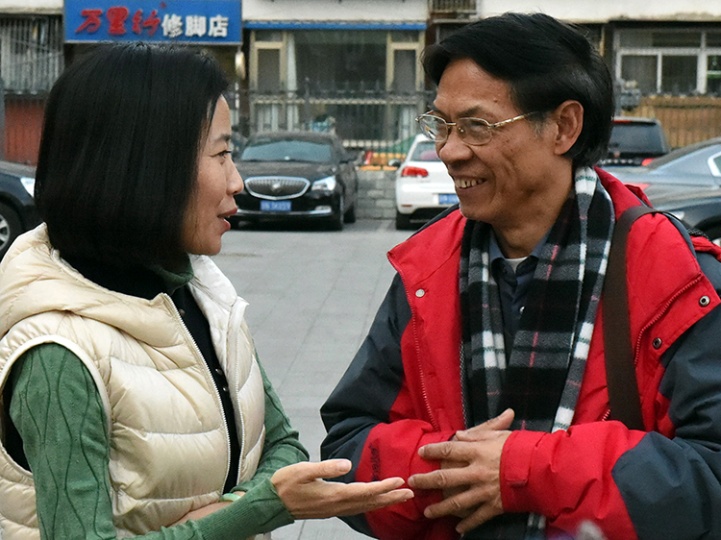 這是黃綿瑾(右)與中國評劇院院長侯紅(左)就評劇藝術(shù)進行交流(唐召明2017年11月26日攝)