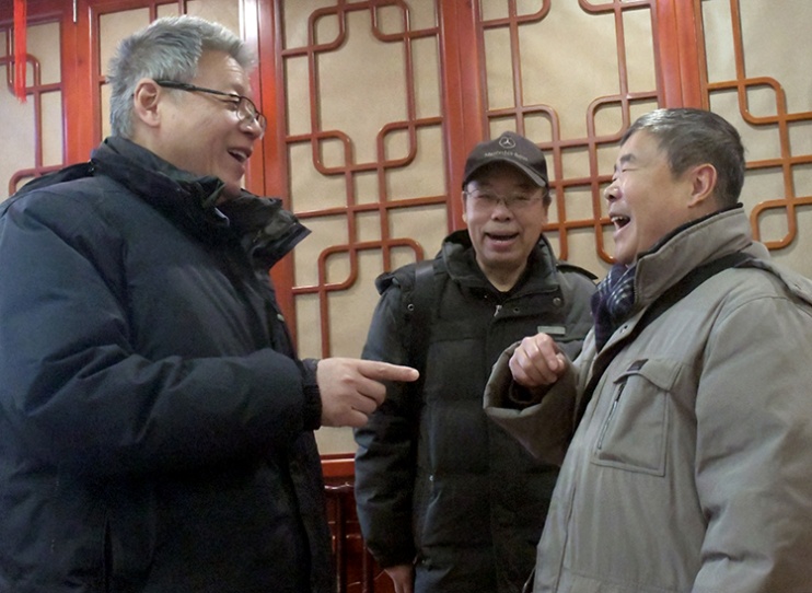 這是北京建藏援藏工作者協(xié)會原會長范小建(左)、原副會長羅廣武(中)和李業(yè)壯(右)在暢談西藏往事(唐召明2019年12月26日攝)