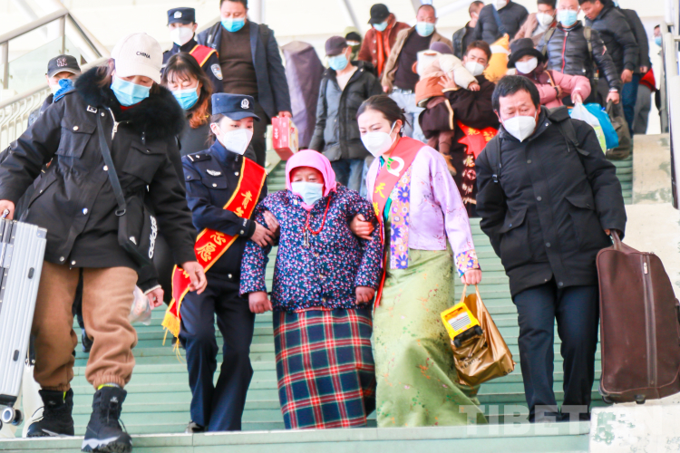 圖為拉薩鐵路公安處“格?;ā迸泳M民警與拉薩火車(chē)站志愿者共同為老年出行旅客提供幫助(胡安鵬 攝)